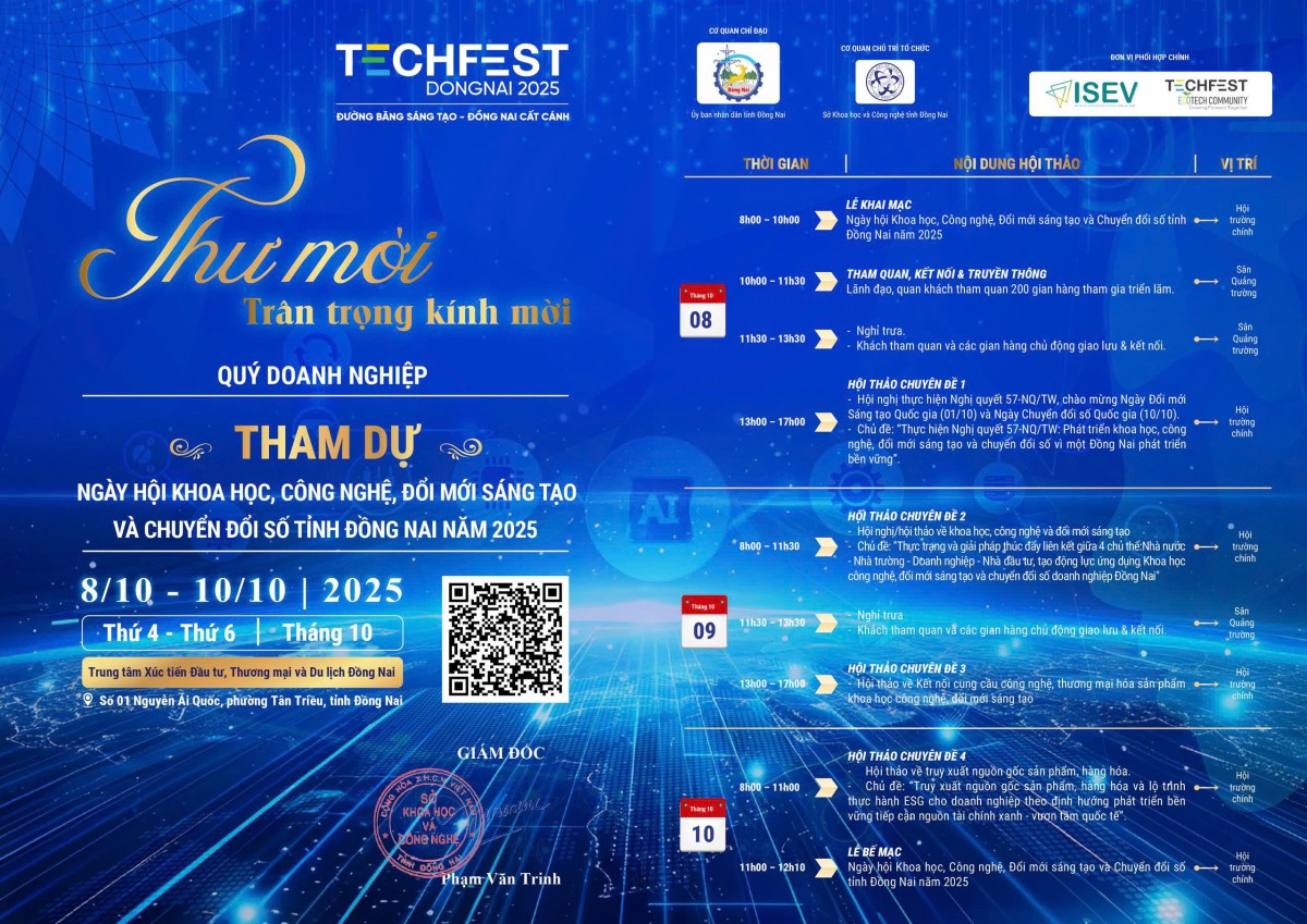 Với chủ đề "Đường băng sáng tạo – Đồng Nai cất cánh", Techfest Đồng Nai 2025 hứa hẹn mang đến một diễn đàn kết nối hiệu quả, góp phần hiện thực hóa mục tiêu phát triển vùng Đông Nam Bộ trở thành trung tâm đổi mới sáng tạo hàng đầu cả nước.